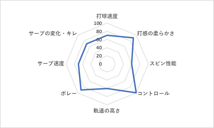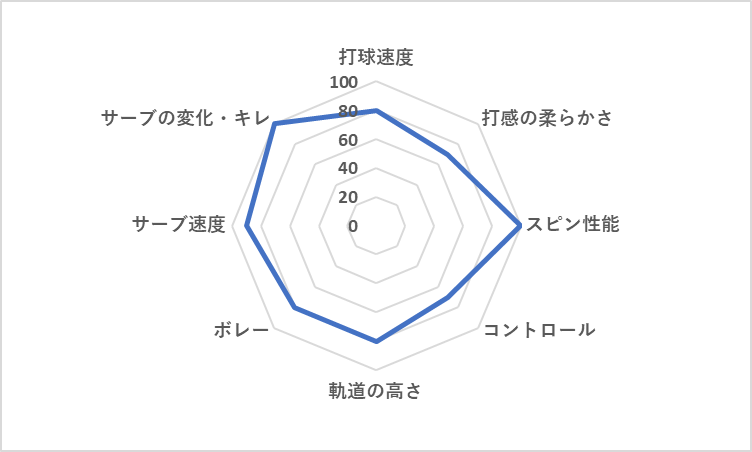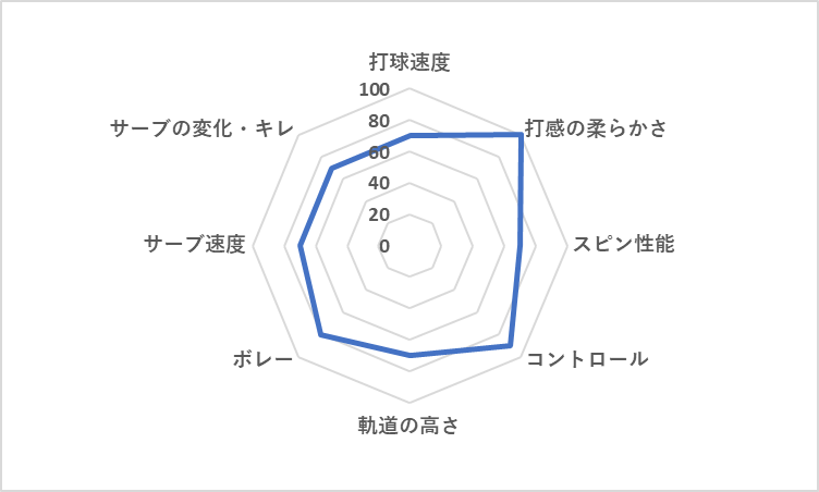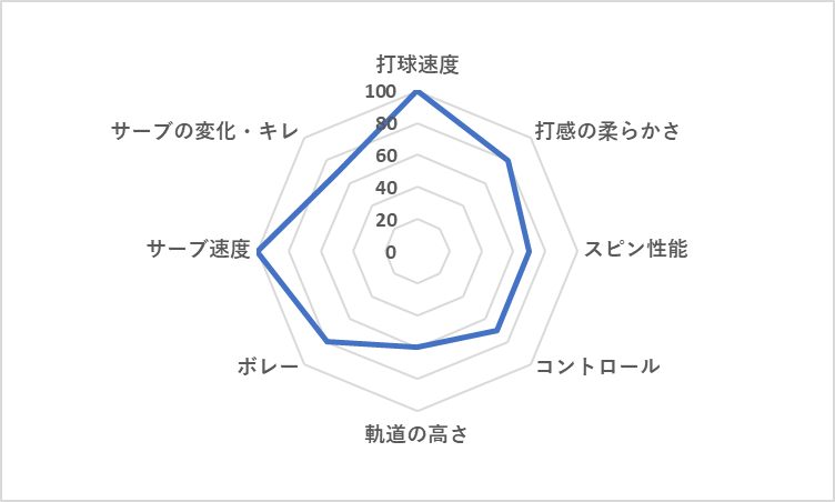 | 打球速度 | 打感の柔らかさ | スピン性能 | コントロール | 軌道の高さ | ボレー | サーブ 速度 | サーブ 変化・キレ | |