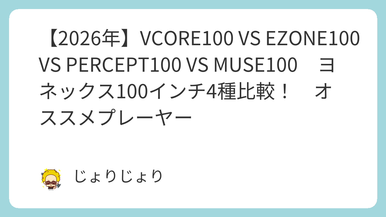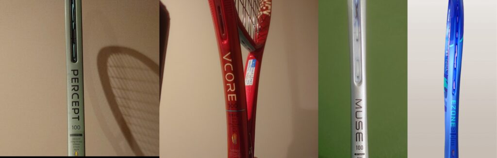 ヨネックスのテニスラケットにおける「100平方インチ・300g前後」のカテゴリーは、選び放題ですね。2026年モデルのVCORE 100、2025年に登場したEZONE 100、コントロールのPERCEPT 100、そして新たな選択肢として加わったMUSE 100。